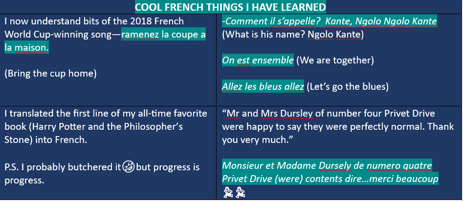 I started learning French to be conversant with a language half of Africa uses (francophone Africa) and to learn how to stick with something for a long time.