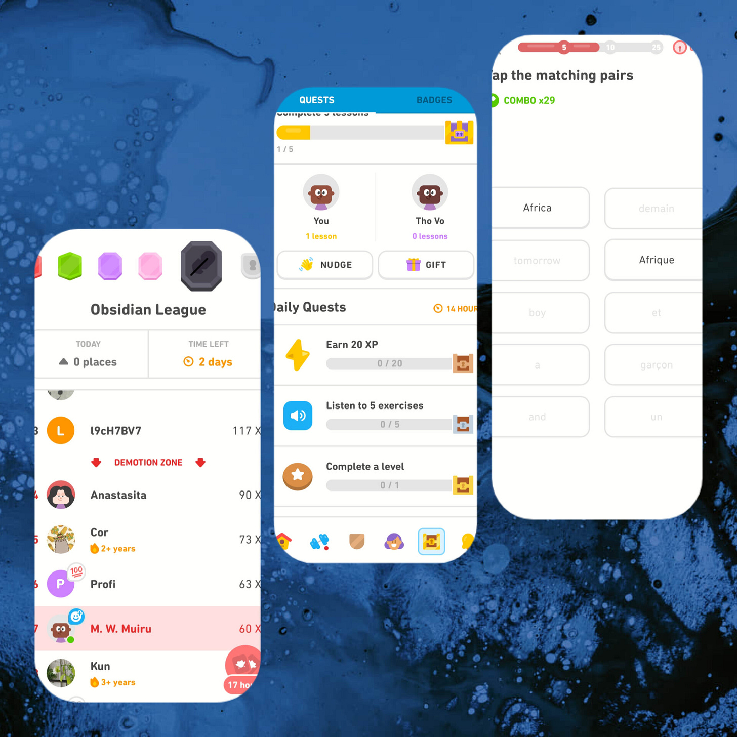 It was, therefore, a shock to realize that the gaming elements on Duolingo worked on me. I don't particularly appreciate being demoted, I always spend a few more minutes on the app to complete the quests, and I love the timed challenges.